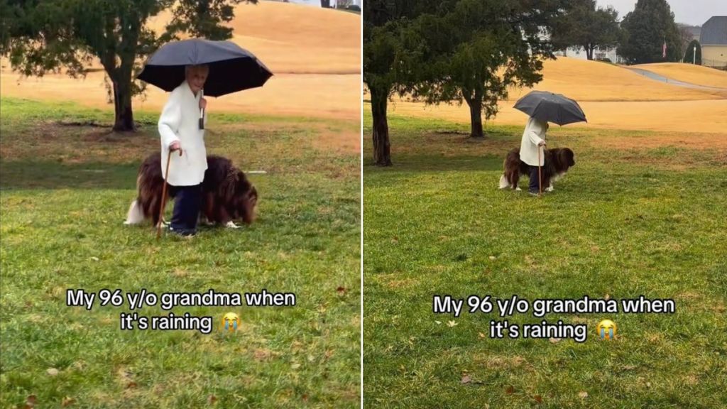Viewers couldn’t get enough of the dynamic, with one user writing, “Please let grandma do her grandma duties next time.” Another added, “If grandma thinks he needs to be covered, by God that pup needs to be covered.” A third viewer joked, “That’s her great grandson …. Of course she’s holding the umbrella over Chewy.” And one comment pointed to the tenderness of it all: “I love that he is bigger than her… But that’s still her baby and he is so gentle with her.”