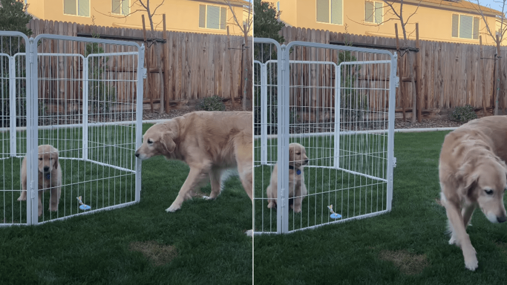 The video starts on a sweet note, with Winnie approaching the Golden Retriever puppy with soft and friendly body language. He wags his tail, looking like a calm adult about to make an acquaintance with a younger kid. Meanwhile, Wilson sits inside a small enclosed play area in the yard, watching Winnie come closer, momentarily pausing when they make eye contact, just long enough for the moment to feel sweet. And then suddenly, Wilson lets out a single bark.
