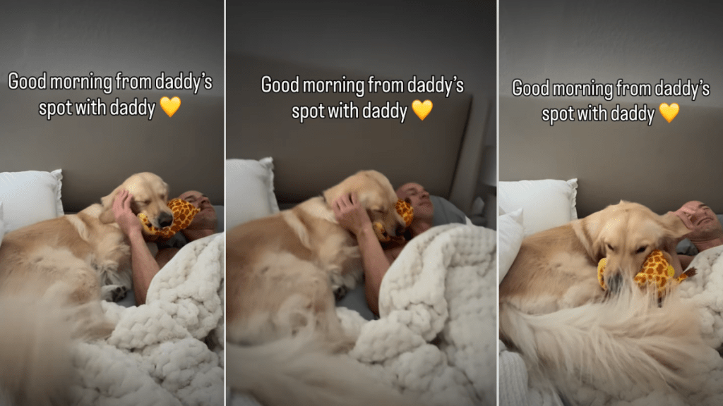 In the video, the Golden Retriever stays close to her dad, thumping her tail against the blankets, and sitting in a way like her only job is to guard him. The on-screen caption says, “Good morning from daddy’s spot with daddy.”